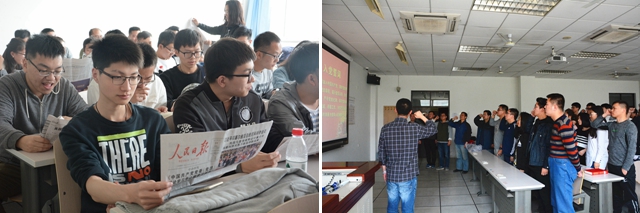 教工党支部书记左哲老师带领大家一同阅读了《人民日报》《习近平总书记系列讲话读本》等文刊,并向大家抛出了一个问题:“‘四讲四有’应该如何解读?”这一疑问在台下引起了激烈的讨论。学生支部书记鲁怡表示:“‘四讲四有’第一条讲政治,有信念,就是要求共产党员,尤其是年轻的共产党员要不断坚定理想信念,永远牢记过去,反思现在,展望未来,这正是我们此次党日活动的目的所在。”