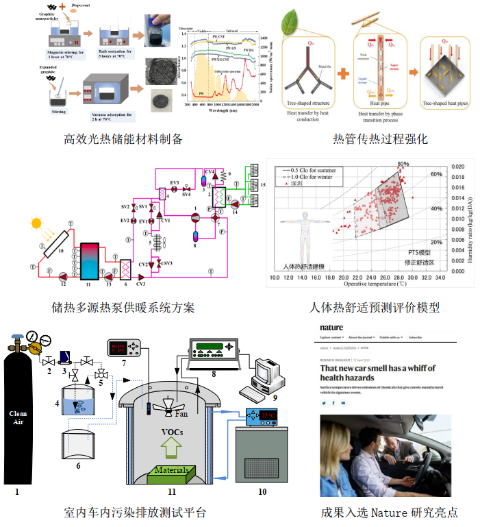 针对建筑可再生能源热利用中的高效储热、强化传热、系统优化及环境营造方面开展研究,拥有相变/热化学储能实验室、光热储能新材料实验室,以及低碳能源与储热技术中英联合实验室。深化了梯级相变储热理论,在高效光热储能新材料方面取得了一定突破,对热储能供暖设备与系统开展了设计与性能优化,一半以上发明专利实现了成果转化。同时,围绕人工环境控制中的能源环境交叉学科问题,开展室内车内环境污染调控、热舒适及传质等方面的研究,建有室内车内污染排放测试平台,提出了环境营造过程的系列数理模型及参数测定方法,完善了适应性热舒适机理与评价模型。在顶级期刊发表论文200余篇,总引用8000余次,团队教授连续两年获评全球前2%顶尖科学家,部分成果入选Nature研究亮点。