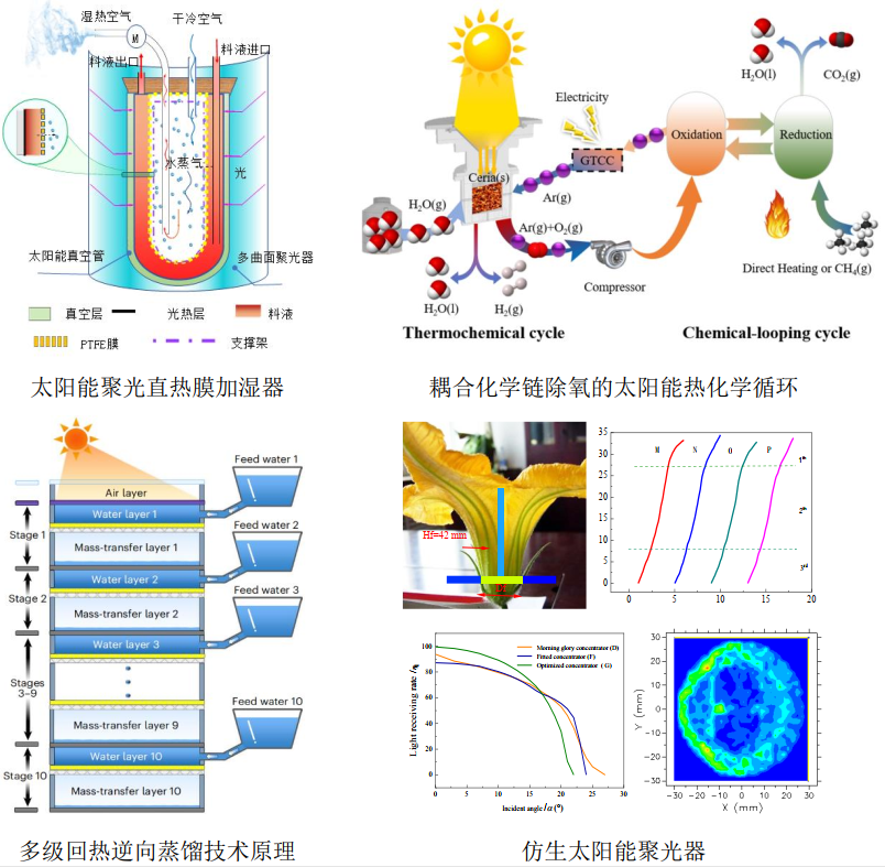 针对太阳能利用存在的低密度、间歇性、利用效率低等问题,创新地提出了高效透射式聚光、柔性聚光等太阳能系统;提出了耦合化学链循环除氧和高温电解余热余气回收的新方式,提高太阳能到燃料的转化效率;发展了太阳能海水淡化过程的热力学循环理论,建立了超高效率、超耐盐多级回热型可扩展系统。未来将继续耕耘高效聚光集热技术、高效太阳能热化学制氢技术、及基于光热的热---水综合利用与海水/苦咸水深撤资源化利用技术研究。