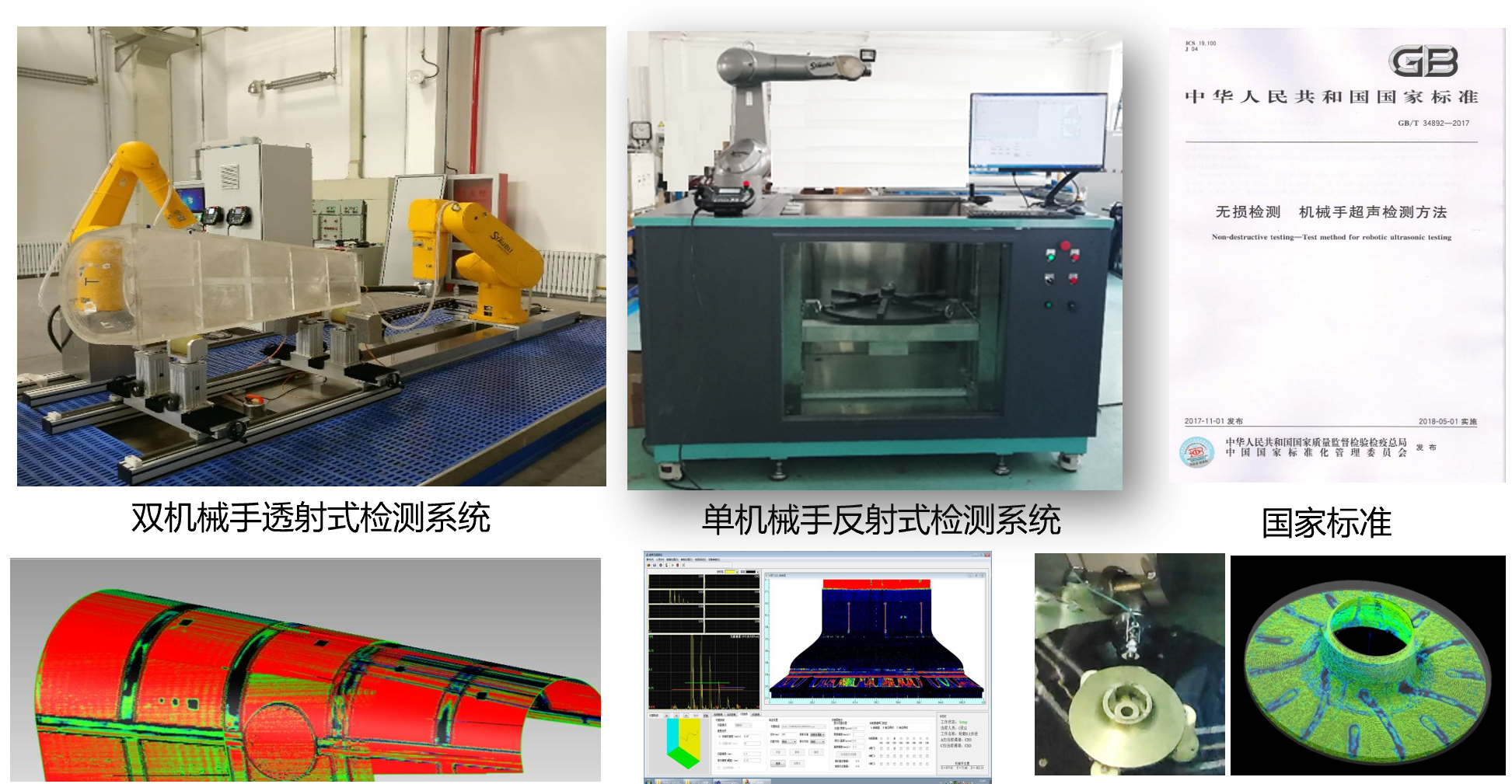 在国家“高档数控机床与基础制造装备”重大专项、国防重点专项、装发共用技术等项目资助下,攻克了定位精度控制、轨迹规划、扫查点空间位置信息同步采集、基于机器学习的缺陷信号识别、三维显示等多项关键技术,形成了针对回转构件和复杂曲面复合材料等复杂构件的大型复合材料复杂构件的机械手超声检测系统。