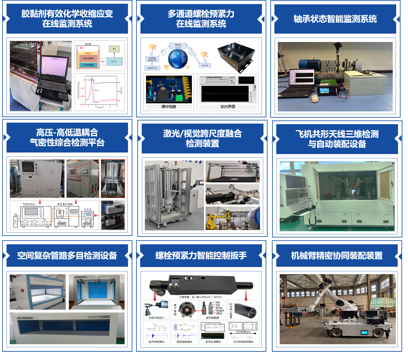 智能装配与检测技术既是智能制造领域的“卡脖子”核心环节,也是推动制造业高质量发展的关键支撑。面向精密装配对自动化与智能化的迫切需求,团队融合机器人、机器视觉、多传感器融合等技术,研制了多套实验平台,包括针对胶接、螺纹、轴承等装配结构性能测试的胶黏剂有效化学收缩应变在线监测系统、多通道螺栓预紧力在线监测系统、轴承状态智能监测系统,以及高压-高低温耦合气密性综合检测系统。在装配光学检测方面,针对大曲率/强反光条件下三维共形天线测量数据缺失的问题,团队开发了激光/视觉跨尺度融合检测装置;针对卫星跨尺度测量难的挑战,研制了飞机共形天线三维检测与自动装配设备,有效解决了装配工艺中跨尺度、原位、高精度、高效率的测量难题。
