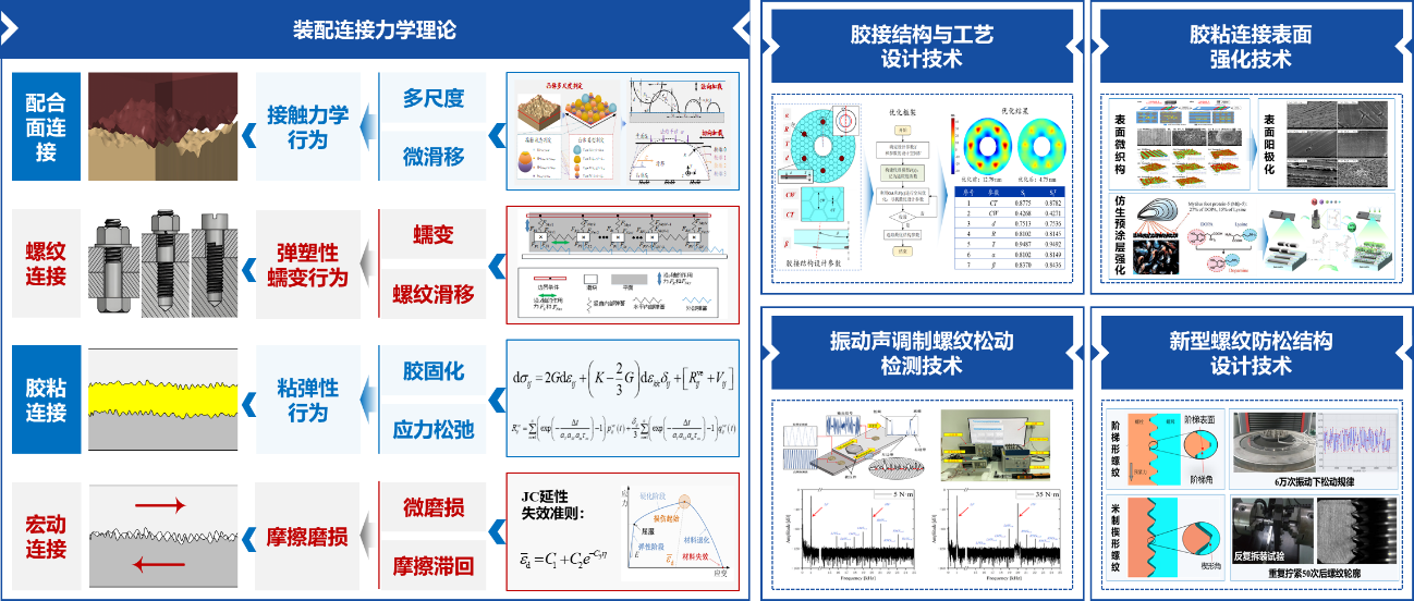 在此基础上,突破配合面连接表面主动设计技术,通过表面形貌优化与微观织构设计实现接触与密封状态的主动调控;发展螺纹连接松动检测与防松技术,提出防松性能评价方法与新型螺纹设计方法;攻克胶粘连接结构/工艺设计及表面强化技术,实现胶粘工艺的高精度高可靠连接。相关研究成果已在惯性仪表、光机装备、导引头、火箭等国家重大装备中得到应用,为精密装配提供了坚实的理论与技术支撑。