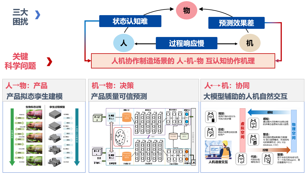 面向复杂产品装配中近距离共域协作与强不确定作业需求,开展人机协作装配技术与装备研究,实现人的灵活感知与经验判断与机器的高精度、稳定执行优势互补。围绕“人机物互认知协作机理”这一核心科学问题,研究在实时安全约束下对装配对象状态的可观测建模、对装配质量的可信预测,以及基于大模型的人机自然交互与协作决策,将状态、质量与交互意图等信息耦合,驱动协作任务规划与柔顺执行,从而在安全、效率、质量等多目标之间实现动态权衡与最优。首先,研究面向装配对象与过程的状态表征方法,构建装配几何—物理状态的在线估计与不确定性表达,实现关键状态的可观测、可解释与可追溯。其次,面向小样本与多变工况,研究机理约束与数据驱动融合的质量预测模型,实现对装配偏差演化、缺陷风险等的在线预测,支撑多目标约束下的动态决策。最后,研究面向装配场景的大模型方法,融合语音、文本与作业上下文,实现对操作者意图的鲁棒理解、对工艺知识的可解释问答与对协作策略的生成式辅助;进一步将交互结果与安全约束、工艺规则和在线状态估计联动,提升协作过程的易用性、可控性与可信度。