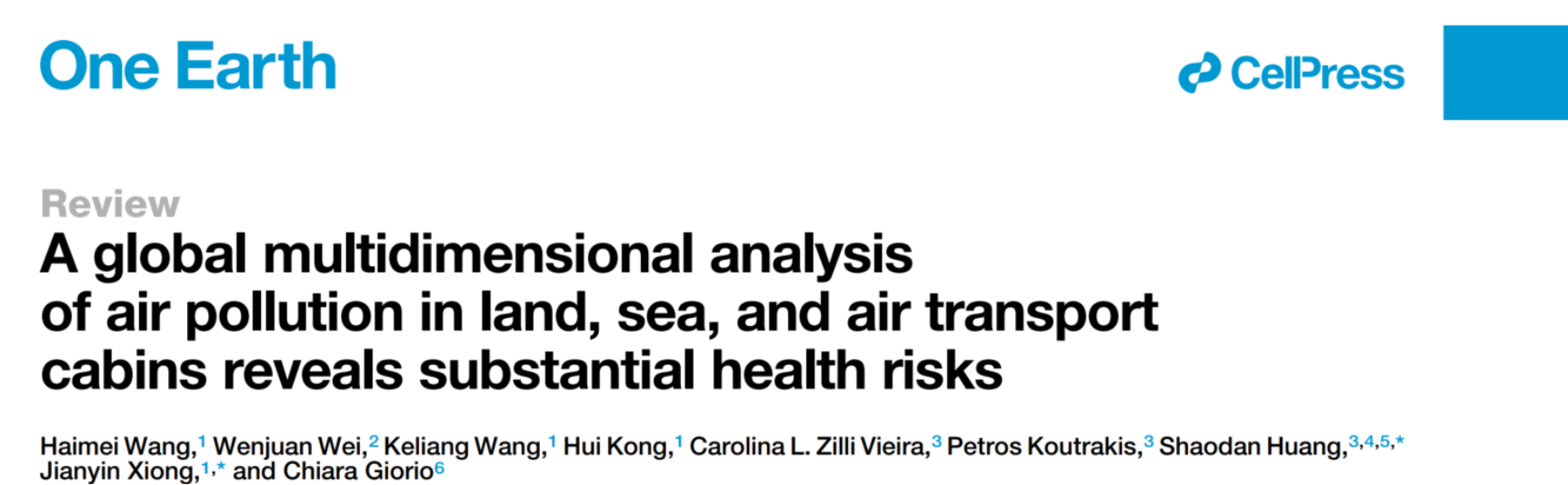 论文详情:Haimei Wang, Wenjuan Wei, Keliang Wang, Hui Kong, Carolina L. Zilli Vieira, Petros Koutrakis, Shaodan Huang*, Jianyin Xiong*, Chiara Giorio.A global multidimensional analysis of air pollution in land, sea, and air transport cabins reveals substantial health risks.One Earth 8, 1-16 (2025).