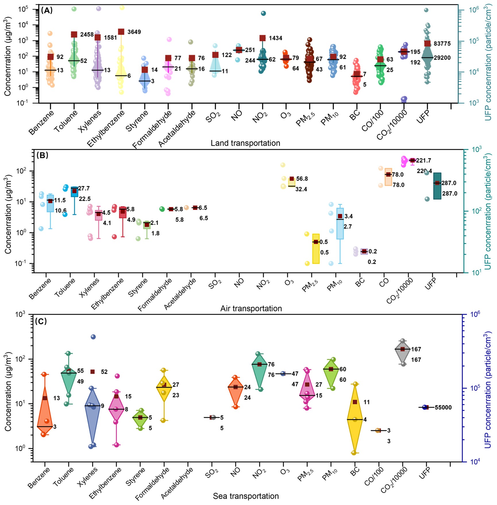 图3. 陆(A)、空(B)、海(C)交通工具座舱中17种污染物浓度的箱形图. 红色方块表示平均值;黑线表示中值.