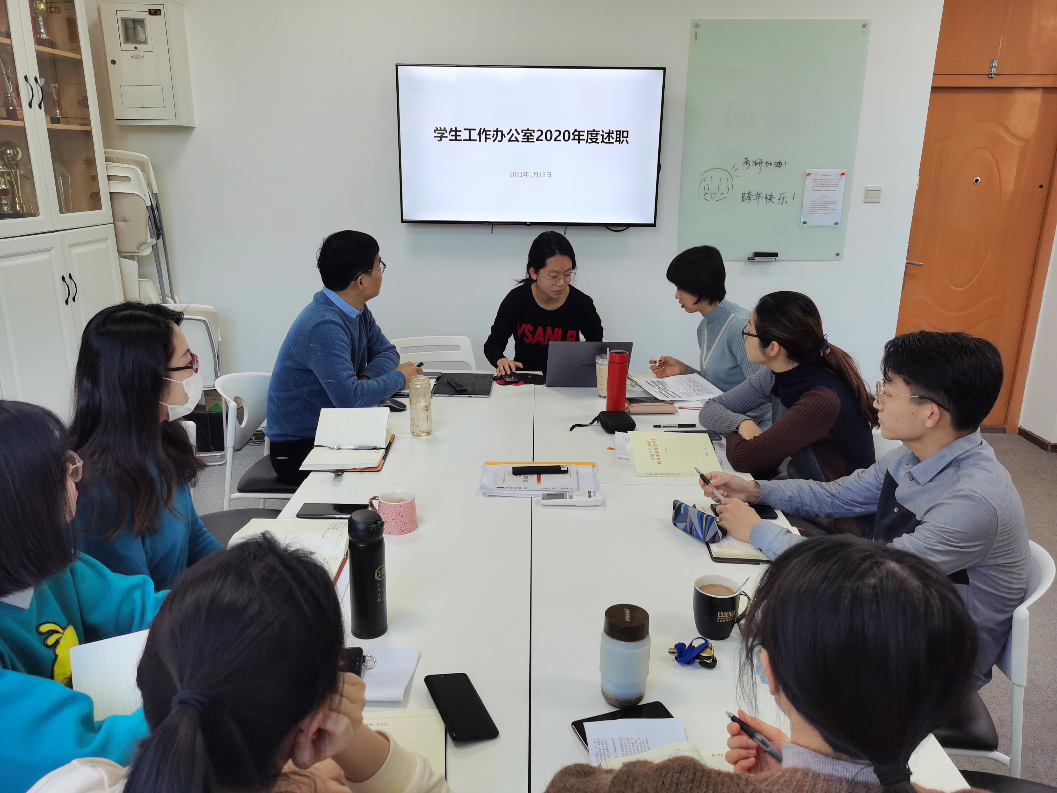 述职结束后各位辅导员彼此进行了意见交流,对辅导员个人及学生工作提出建议。会议最后,党委副书记、副院长孙硕进行总结,她对学生工作队伍本学期坚持的“每周一工作例会、周五学习研讨、每月对标任务表、每年业绩达成考核”的团队工作模式及产出的辅导员学习分享文稿、理论学习汇编、制度汇编等材料进行了肯定,同时对学院学生工作队伍提出了几点要求:需要进一步提高思想站位,结合十九届五中全会精神做好系统规划和整体把握,以身作则管理和教育学生,在2021年以更好的精神面貌,营造团结向上的团队氛围,提升工作水平,提高工作业绩,助力学院和学校“双一流”建设!