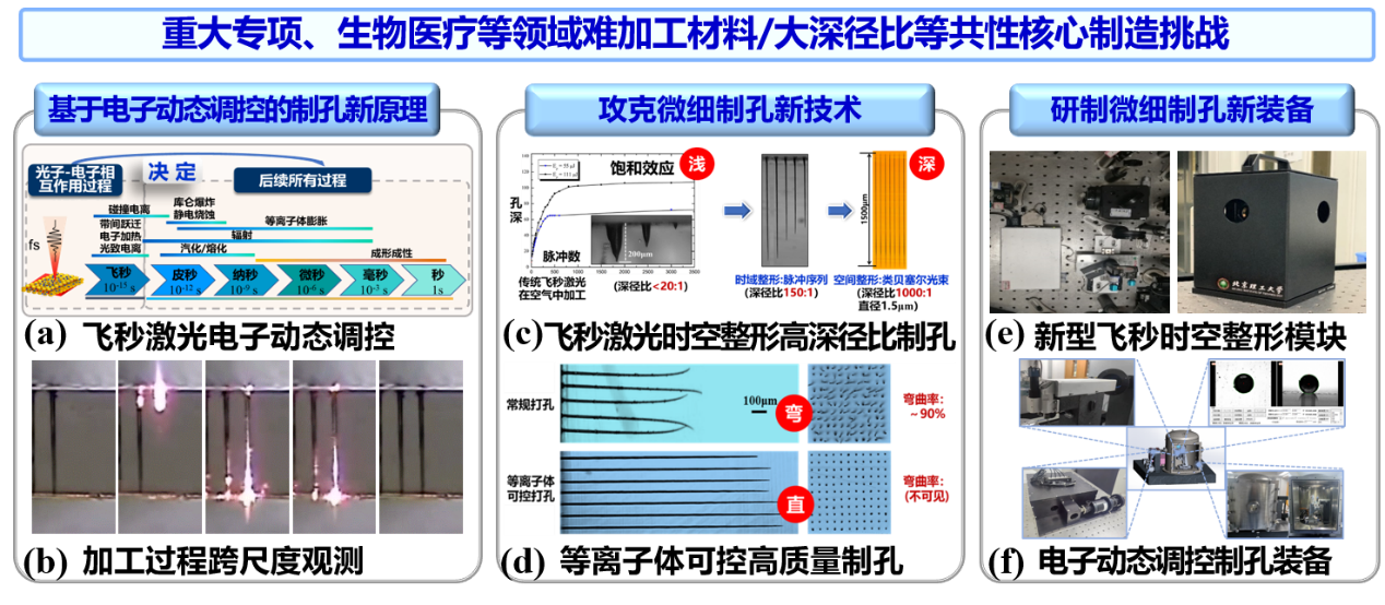 项目介绍:瞄准重大专项、生物医疗等领域难加工材料的高质量微细制孔难题。激光微纳制造研究所的“飞秒激光”团队经项目调研、讨论、实验研究,基于飞秒激光电子动态调控的核心思想,提出时空整形微孔加工新方法新技术,攻克了高深径比、高质量、高一致性微细制孔难题,研制了制孔新装备,为重大专项、生物医疗等领域提供了关键制造支撑。团队成员矢志国防,努力用自己所学知识实现军工报国。