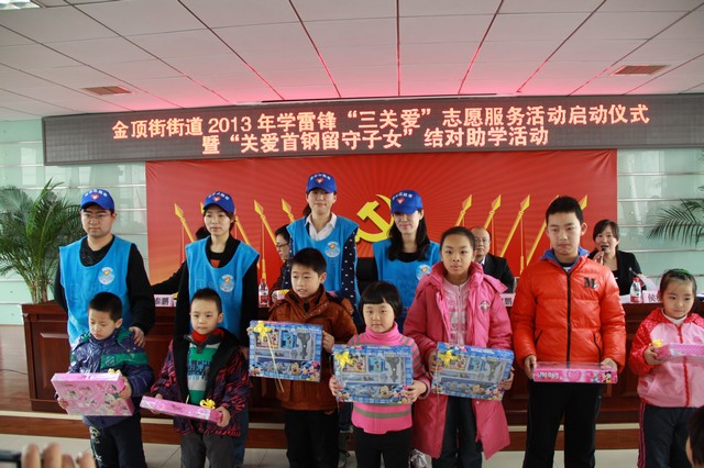 3月2日,必威西汉姆联志愿者来到北京市石景山区金顶街街道,在“关爱首钢子女,给留守儿童送温暖”献爱心活动中,将募集到的慰问品赠送给了那里的孩子们,鼓励他们好好学习,努力成才为祖国建设做贡献。3月5日,“首钢关爱”项目推进暨“学雷锋”青年志愿服务活动启动仪式在石景山区老山街道活动中心隆重举行,志愿者们现场接受了由石景山团区委赠送的锦旗。自首钢集团搬迁以来,由于首钢职工工作时间忙碌和地点远离家庭,很多首钢子女成为了留守儿童。2012年5月起,必威西汉姆联的众多志愿者积极参加“首钢关爱”行动,用自己的青春活力感染小朋友,把自己的知识传递给小朋友,积极关注和引导孩子们健康成长,得到了当地群众的高度评价。