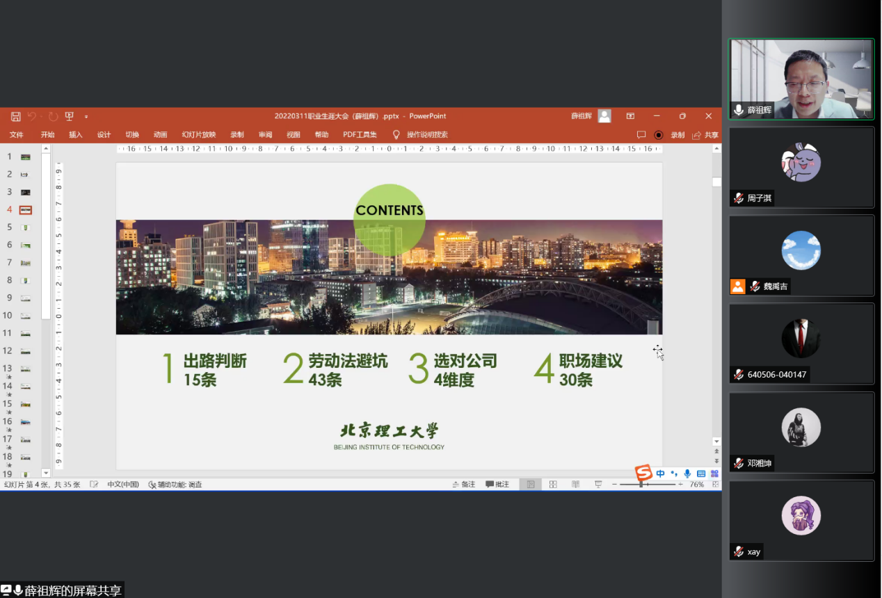 薛祖辉结合十余载人力资源从业经验进行了分享。他从出路判断、劳动法避坑、评判公司维度和职场建议等四方面为同学们进行了深度剖析。他鼓励大家既要仰望天空又要脚踏实地,只要认真生活、努力工作、不断学习,无论怎么选择都将收获成功。