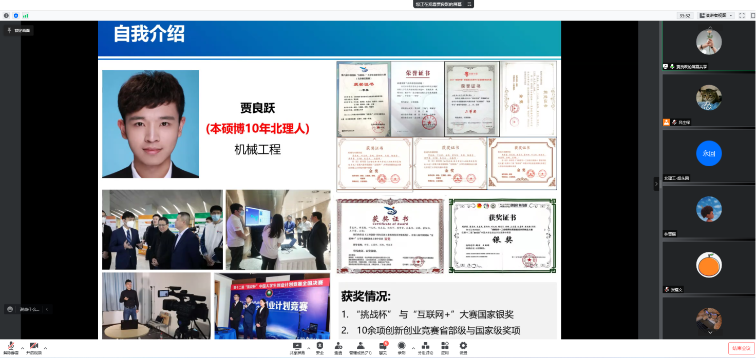 随后由获得第六届中国国际“互联网+”大学生创新创业大赛全国银奖项目负责人贾良跃分享参赛经验,并从作品选题、团队构建、申报书撰写、汇报答辩等方面进行了详细讲解,强调只有长久坚持才能有更好的成绩。