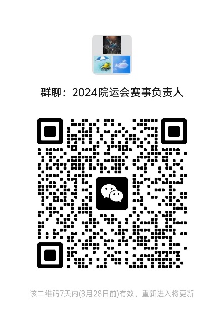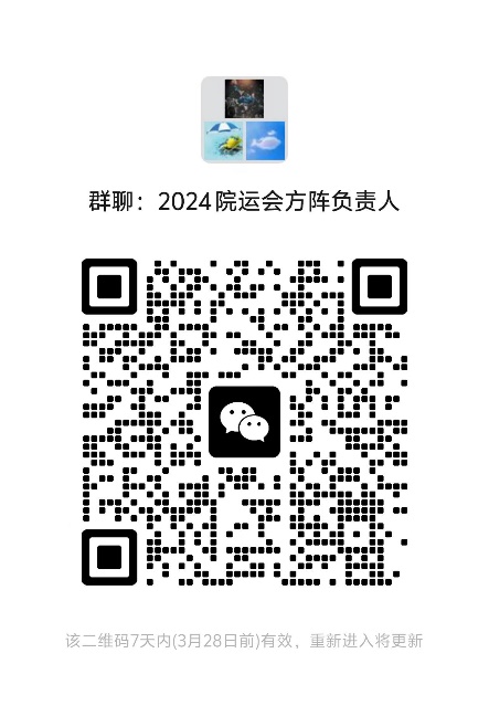 7.方阵组队研究生以研究所为单位,本科生以专业为单位进行组队,参与人员需为教师、学生共同参与,其中方阵引导人需为教师,请各研究所、专业指定1人为方阵负责人并于3月24日20点前扫描下方二维码进入“2024年学院运动会方阵负责人群”(建议方阵负责人与赛事负责人不兼任)。方阵表现与精神文明奖评比挂钩。