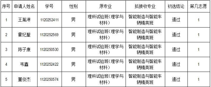 根据学校教务部2025-2026学年第一学期转专业工作安排,依据《必威西汉姆联(2025-2026学年第一学期)接收转专业工作实施方案》,本着公正、公平、公开的原则,经过报名、资格审查、面试考察等流程,经学院转专业工作专家组讨论通过,现将初选结果名单公示如下: