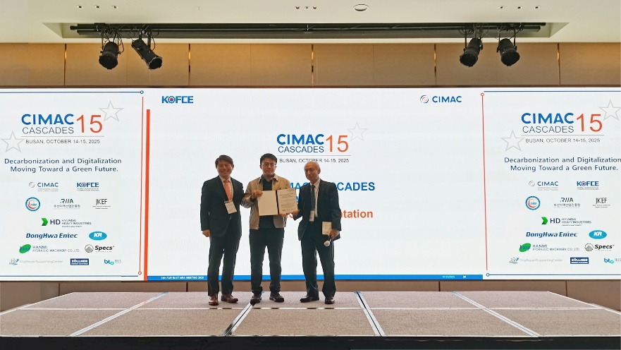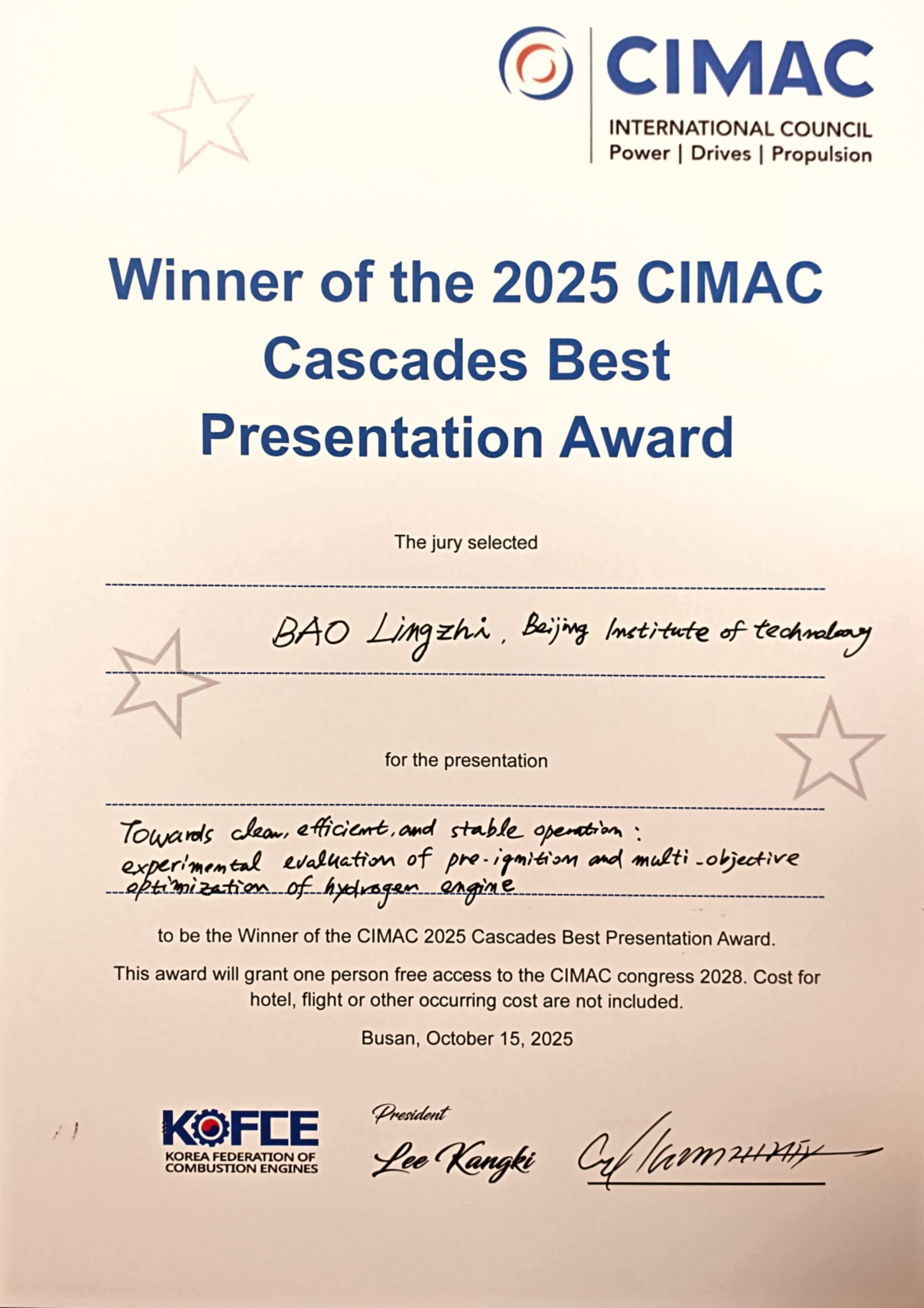 在10月15日的大会闭幕式上,韩国内燃机学会主席Lee Kangki和CIMAC理事、日本内燃机联合会秘书长Masayoshi Kawakami共同为包凌志颁发了最佳报告证书。同时授予包凌志2028年CIMAC国际大会免费参会资格,期待其在全球舞台上持续贡献中国学者的智慧与力量。