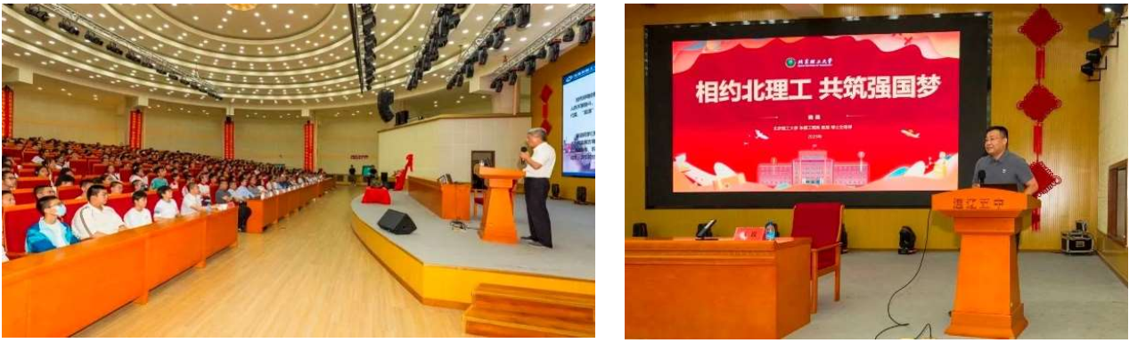 毛明院士向通辽五中师生作《装甲兵器技术发展趋势》主题讲座,魏巍教授作“相约北理工,共筑强国梦”的主题宣讲。