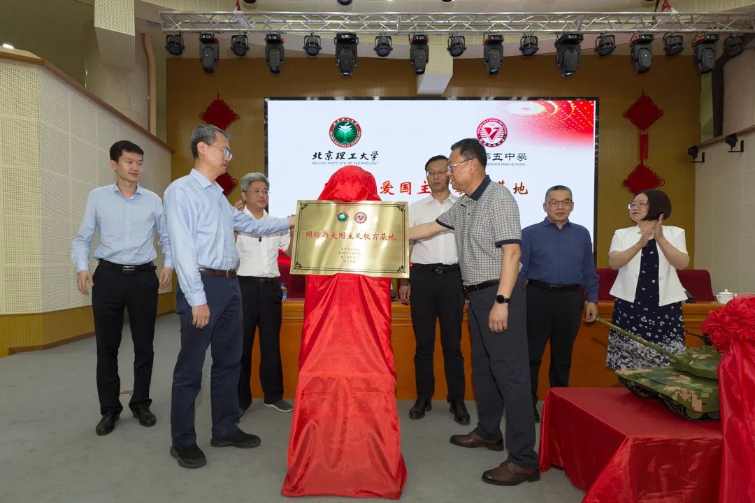 席军强向通辽第五中学授予“国防与爱国主义教育基地”牌匾,通辽第五中学校长王子忠代表学校接牌。