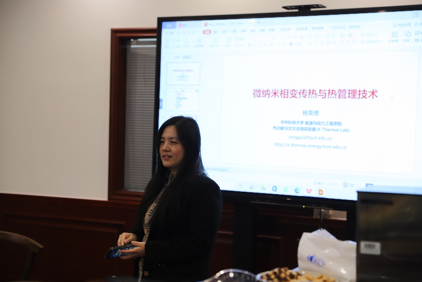 在本次报告会上,杨荣贵教授结合自己多年来的做研究的心路历程,介绍了其课题组在微纳相变传热领域的研究进展,概述了芯片传热领域所面临的难题,引申出传热领域在高热流密度下对于新型热管理技术的强烈需求;接着介绍了其课题组在微纳米结构冷凝问题上的几个突破,主要有纳米线表面、多级纳米线表面,以及三维纳米线表面珠状冷凝换热的强化;此外还讲述了一种利用毛细芯亲疏水相结合的新型膜状冷凝传热强化结构及其机理。在液膜蒸发问题上,报告了几种基于气泡动力学的丝网毛细芯液膜蒸发强化传热研究。报告最后部分,杨荣贵教授展示了他们将基础研究应用到便携式电子器件热管理的超薄VC上的一些工作。