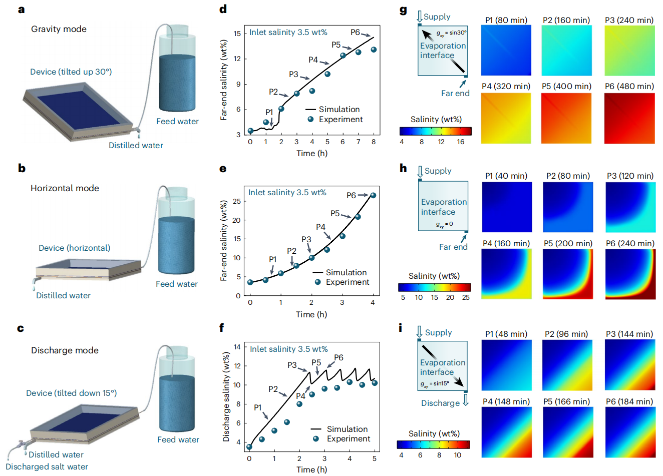 在研究过程中,作者明确了影响系统热性能的三个关键参数:顶部空气层厚度、水层厚度以及传质层厚度,并建立了一套理论模型,以能量转化效率为目标来优化结构参数。其中,水层厚度在影响系统热性能的同时也影响着发生结盐的风险。水层厚度越大,发生结盐的风险越低,但与此同时能量转化效率会更低。因此,需要权衡水层厚度,考虑如何在水层厚度尽可能小的情况下也能够实现抗盐功能。事实上,水层相比亲水材料的最大优势在于水自由流动的特点。在水层中,通过重力可以便捷地诱发水层内部各处具有不同盐度的水的流动。针对这一特点开发出了两种抗盐和排盐的运行模式,将原本水平放置的装置向上方和下方分别倾斜以构建水层内部的盐水流动,实现抗盐和排盐的功能。