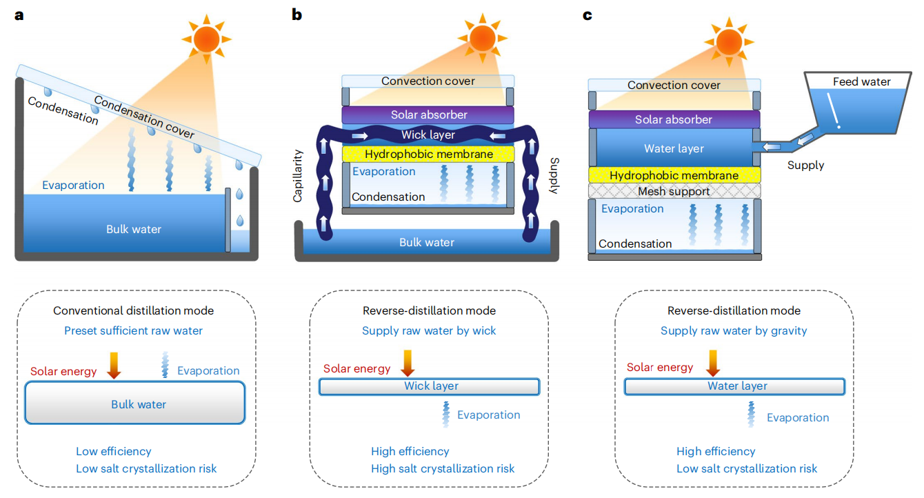 图1. 太阳能驱动的蒸馏模式 (a)传统蒸馏;(b)基于亲水材料的逆向蒸馏;(c)基于水层的逆向蒸馏.