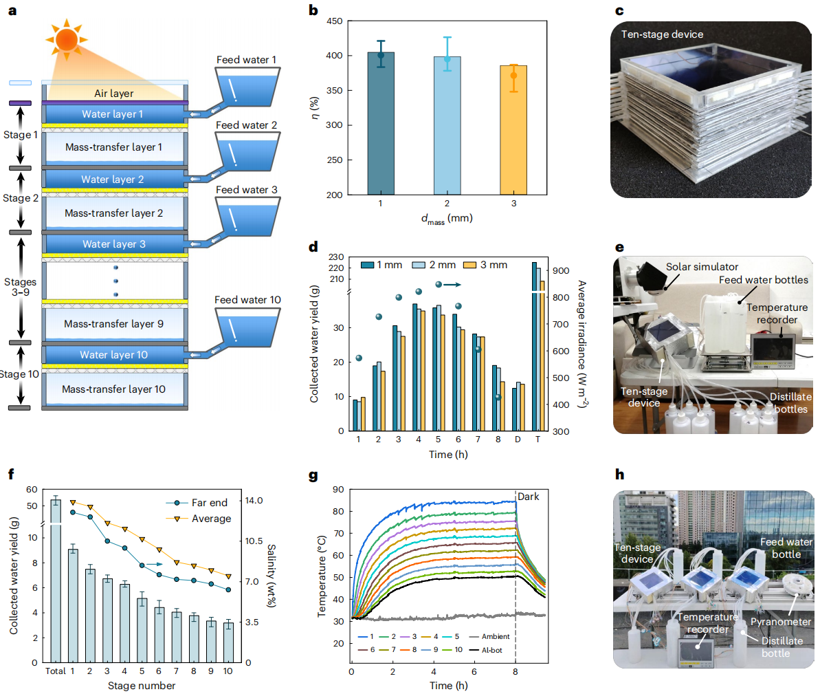 研究揭示了逆向蒸馏系统发生结盐的机理并以可视化的方式诠释了基于水层的逆向蒸馏装置抗盐与排盐的原理。实验结果表明,单级蒸馏装置在常规3.5 wt%盐水环境下实现了60.6 %的太阳能到水的转化效率,并在21 wt%浓盐水环境下以47.4 %的效率可持续地蒸馏。具有10级水层回热结构的装置在常规3.5 wt%盐水环境下取得了354 %的高效率,并在每一级水层中都成功实现了抗盐功能。