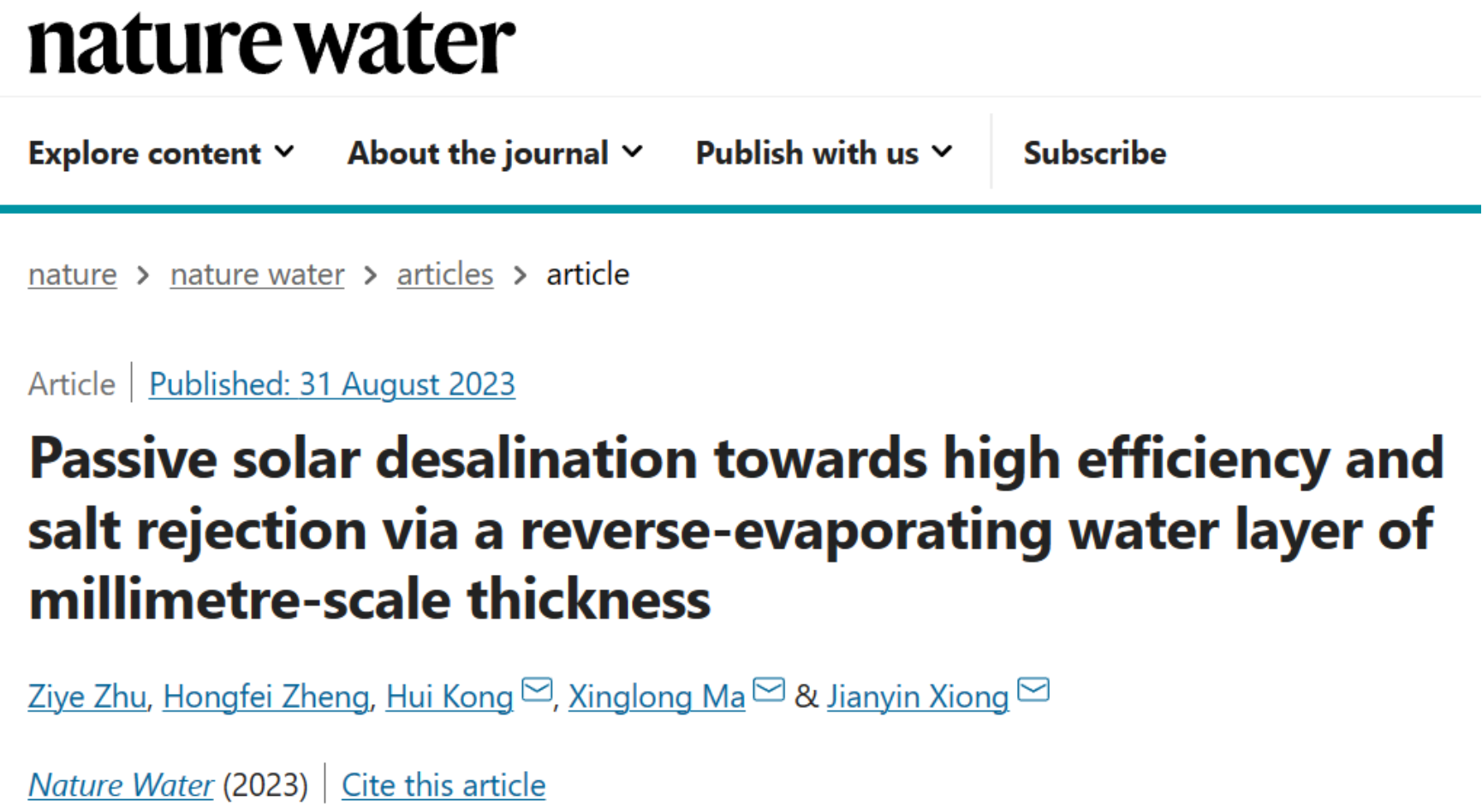 论文详情:Ziye Zhu, Hongfei Zheng, Hui Kong*, Xinglong Ma*, Jianyin Xiong*. Passive solar desalination towards high efficiency and salt rejection via a reverse-evaporating water layer of millimetre-scale thickness. Nature Water (2023). https://doi.org/10.1038/s44221-023-00125-1