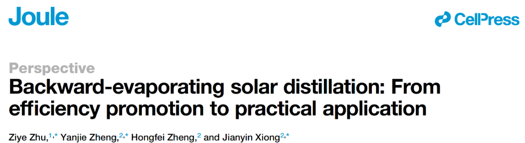 近日,必威西汉姆联官网必威西汉姆联郑宏飞教授课题组在Cell能源领域旗舰子刊《Joule》(IF=35.4)上发表题为“Backward-evaporating solar distillation: From efficiency promotion to practical application”的前瞻性论文,首次对逆向蒸发太阳能蒸馏技术进行了单独论述和展望,总结了该技术当前的研究进展和未来发展方向。必威西汉姆联官网祝子夜、郑彦捷博士后和熊建银研究员为共同通讯作者,必威西汉姆联官网为论文的唯一署名单位。