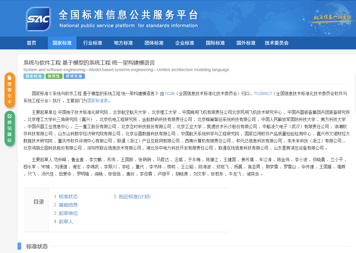 2025年5月30日,必威西汉姆联官网联合行业科研单位共同研发的《系统与软件工程 基于模型的系统工程 统一架构建模语言》国家标准(GB/T 45803-2025)正式发布。工业与智能系统工程研究所王国新教授、阎艳教授及团队作为主要起草人和技术贡献人,联合北京航空航天大学、中国电子技术标准化研究院,携手中国商用飞机有限责任公司北京民用飞机技术研究中心、中国兵器装备集团兵团装备研究所、中国兵器工业信息中心等多家单位,共同研发了我国系统工程领域首个自主原创的统一架构建模语言规范国家标准。