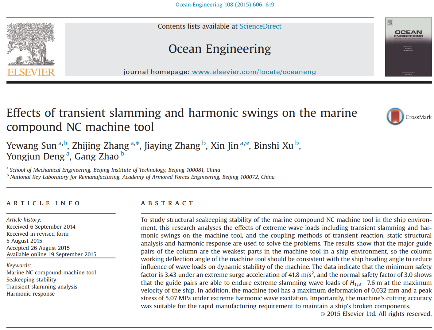 3、能抵抗海陆强颠簸(耐8级海浪颠簸)的动态耐波性设计技术。该项技术相关理论发表在国际著名学术期刊“Ocean Engineering”上。