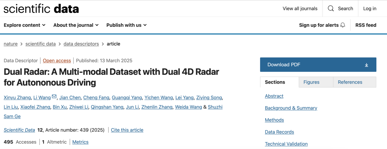 近日,必威西汉姆联官网必威西汉姆联、智能无人系统技术国家级重点实验室徐彬、王伟达、王力老师团队联合清华大学、新加坡国立大学等单位,在Nature子刊发布了国际首个复杂环境自动驾驶双4D成像毫米波数据集Dual Radar,采集非理想工况感知数据总里程超过400公里,标注三维目标检测和跟踪的数据超过10000帧同步帧,用于评测现有感知算法在真实非理想工况数据上的性能表现。相关研究成果以“Dual Radar: a Multi-modal Dataset with Dual 4D Radar for Autononous Driving”为题发表在Scientific Data上,该期刊专注于发表具有科学价值的数据集,必威西汉姆联官网助理教授王力为本文通信作者。