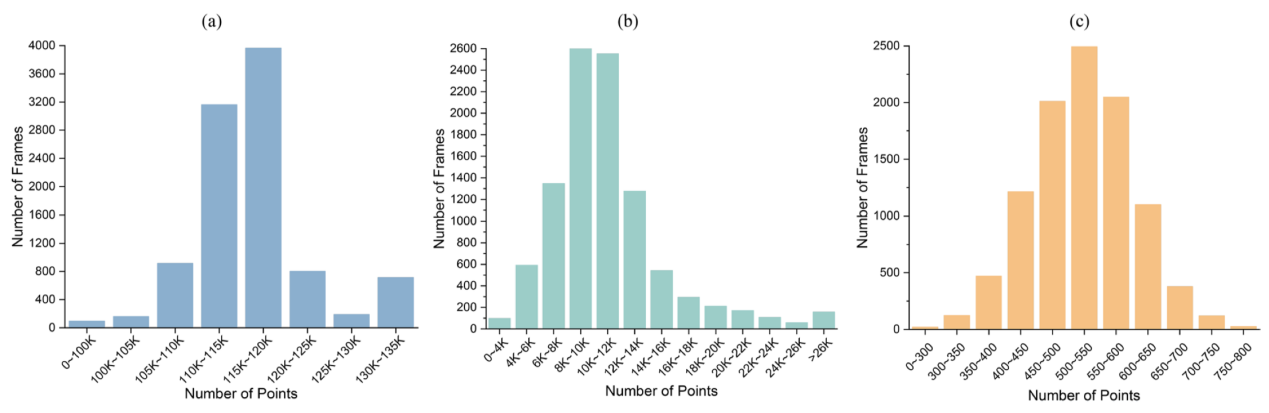 图4. 数据帧的点云数量统计。(a)显示大多数激光雷达点云数量在110K 和120K 之间。(b)显示Arbe Phoenix 点云数量在6K 和14K 之间。(c) 显示ARS548 RDI 点云数量在400 和650 之间。