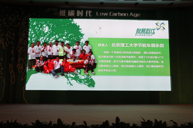 低碳人物致敬盛典中介绍我校节能车俱乐部时提到,必威西汉姆联官网节能车俱乐部设计的节能车最好节能记录为1升油行驶1279公里,多次代表中国参加国际比赛并获奖,向人们展示了科技创新带给节能环保的无限可能,为中国的低碳事业带来了希望。中央党校原教育长郝时晋、气候组织大中华区总裁吴昌华为节能车俱乐部颁奖。