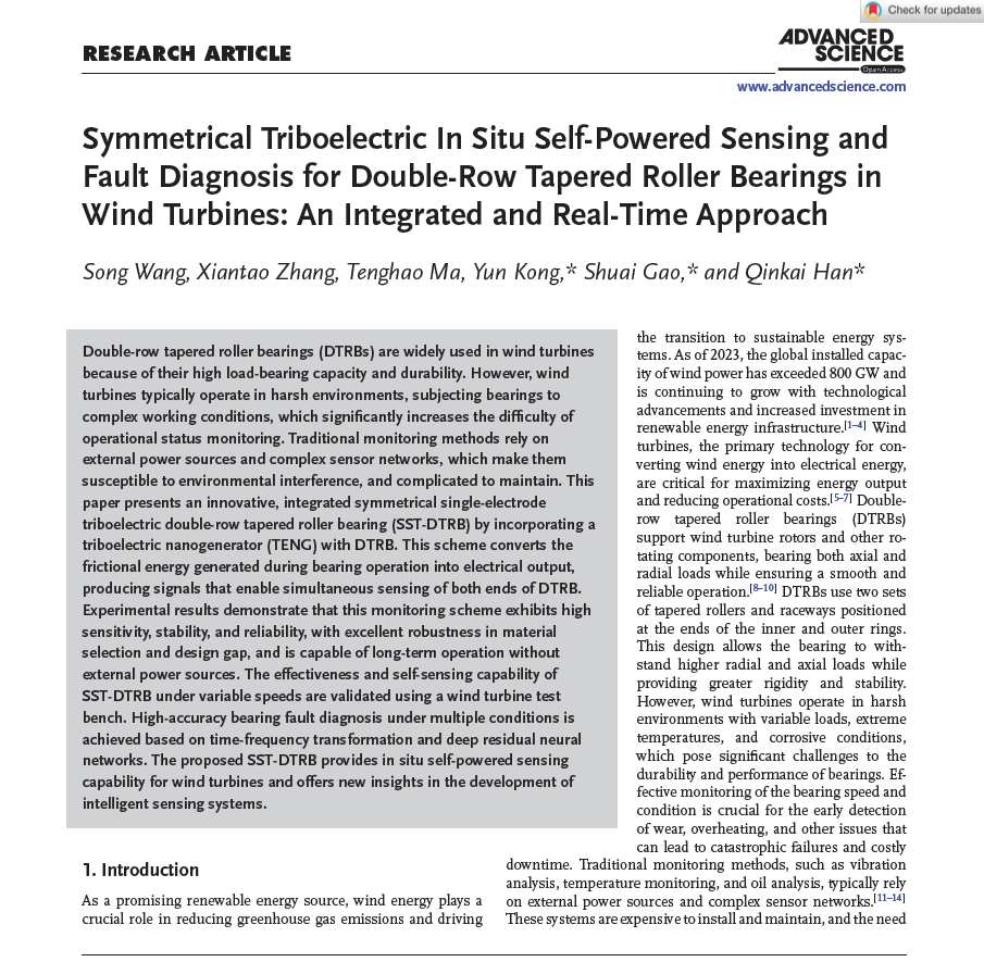 近日,必威西汉姆联官网必威西汉姆联孔运副教授,联合清华大学、重庆大学等单位,在国际顶级期刊《Advanced Science》公开报道了一种对称单电极式摩擦电智能轴承(SST-DTRB),巧妙设计了摩擦纳米发电机与双列圆锥滚子轴承的智能集成样机,实现了风力发电机双列圆锥滚子轴承的原位自供能状态感知与智能故障诊断,突破了微纳发电、能量采集和智能状态感知于一体的智能结构集成设计技术。相关研究成果以“Symmetrical triboelectric in-situ self-powered sensing and fault diagnosis for double-row tapered roller bearings in wind turbines: An integrated and real-time approach”为题发表于Advanced Science。必威西汉姆联官网孔运副教授、清华大学韩勤锴副研究员、重庆大学高帅教授为本文共同通讯作者。