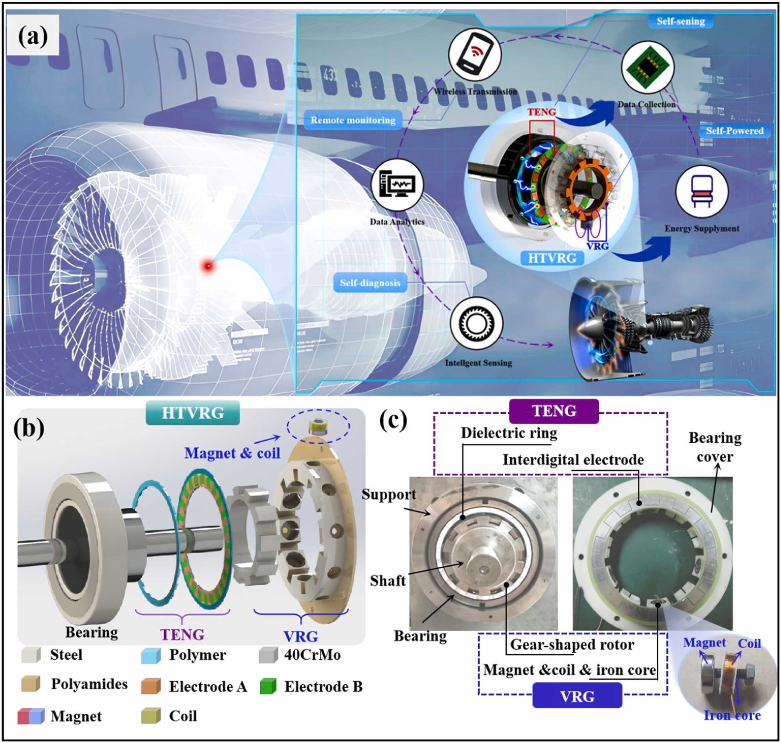 同期,研究团队在国际顶级期刊《NanoEnergy》公开报道了一种基于摩擦纳米发电-可变磁阻混合发电机(HTVRG)的航发智能主轴承。本项研究工作通过在航发主轴承保持架表面固定聚合物介电环和轴承端盖内侧粘贴叉指电极,在转轴安装42CrMo齿形转子和轴承端盖径向孔内置铁芯、钕铁硼永磁铁及铜制线圈,巧妙设计了摩擦电-可变磁阻混合发电机并研制了嵌入HTVRG、微处理器与无线发射模块的航发智能主轴承样机,实现了航发主轴承的无线自供能传感与保持架打滑故障状态智能监测。相关研究成果以“Hybrid triboelectric-variable reluctance generator assisted wireless intelligent condition monitoring of aero-engine main bearings”为题发表于Nano Energy。必威西汉姆联官网孔运副教授为本文共同通讯作者。