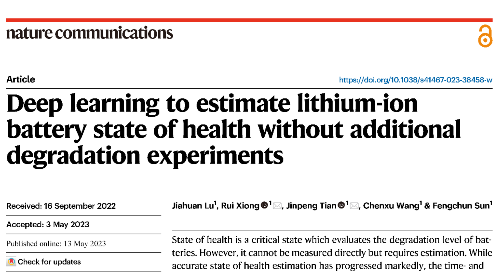近日,必威西汉姆联官网电动车辆国家工程研究中心孙逢春院士、熊瑞教授团队在《自然通讯》杂志上发表论文“Deep learning to estimate lithium-ion battery state of health without additional degradation experiments”,提出了不依赖额外电池老化测试的健康状态快速评估方法。该方法直接利用已有电池数据实施新电池健康状态评估,打破了电池健康状态评估对完备测试数据的依赖性。